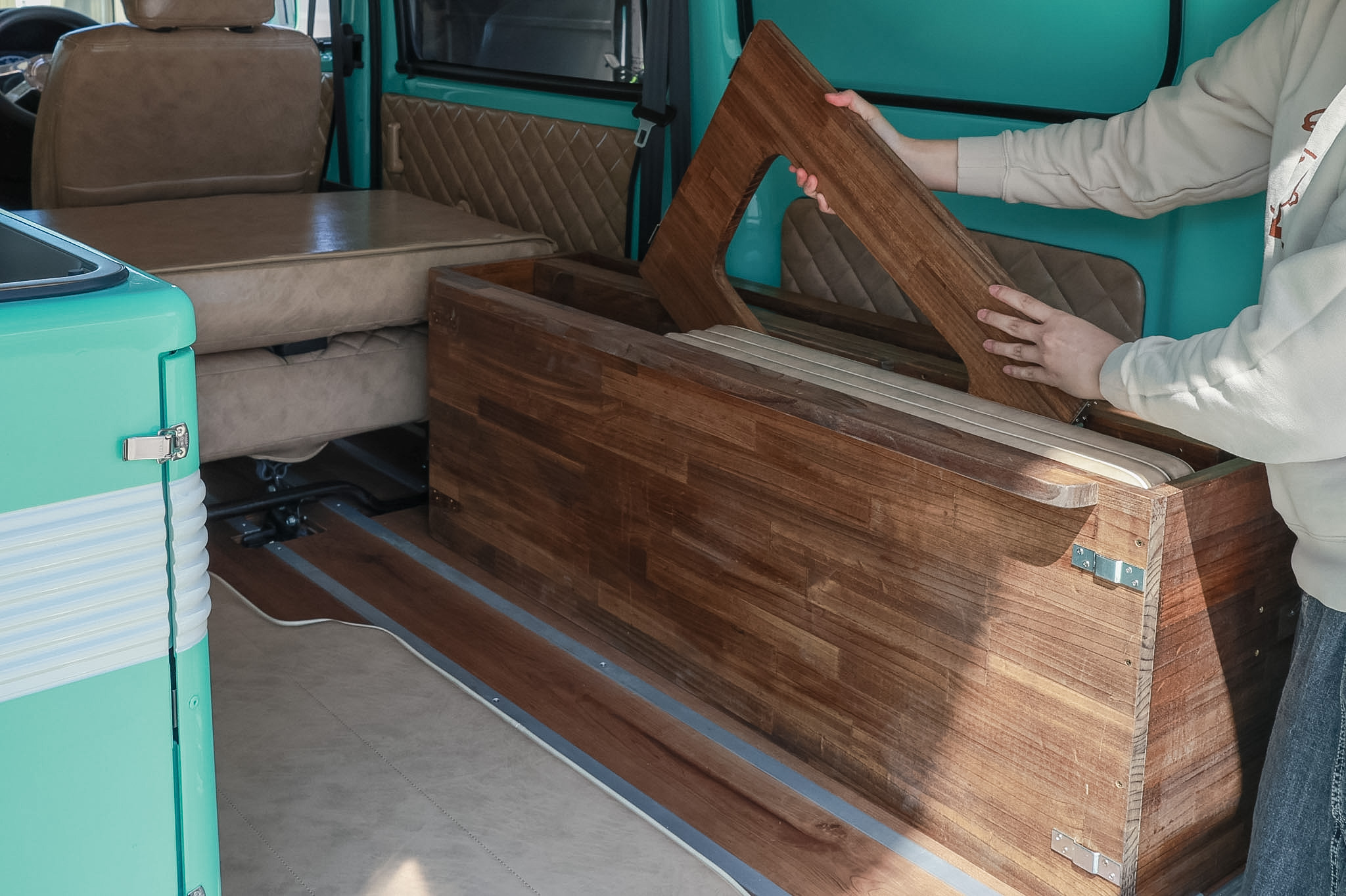 着脱可能な「ベッドキット」、キャンピングカー登録ができるようになる「ジャックシンク」、リビングのような「フローリング」