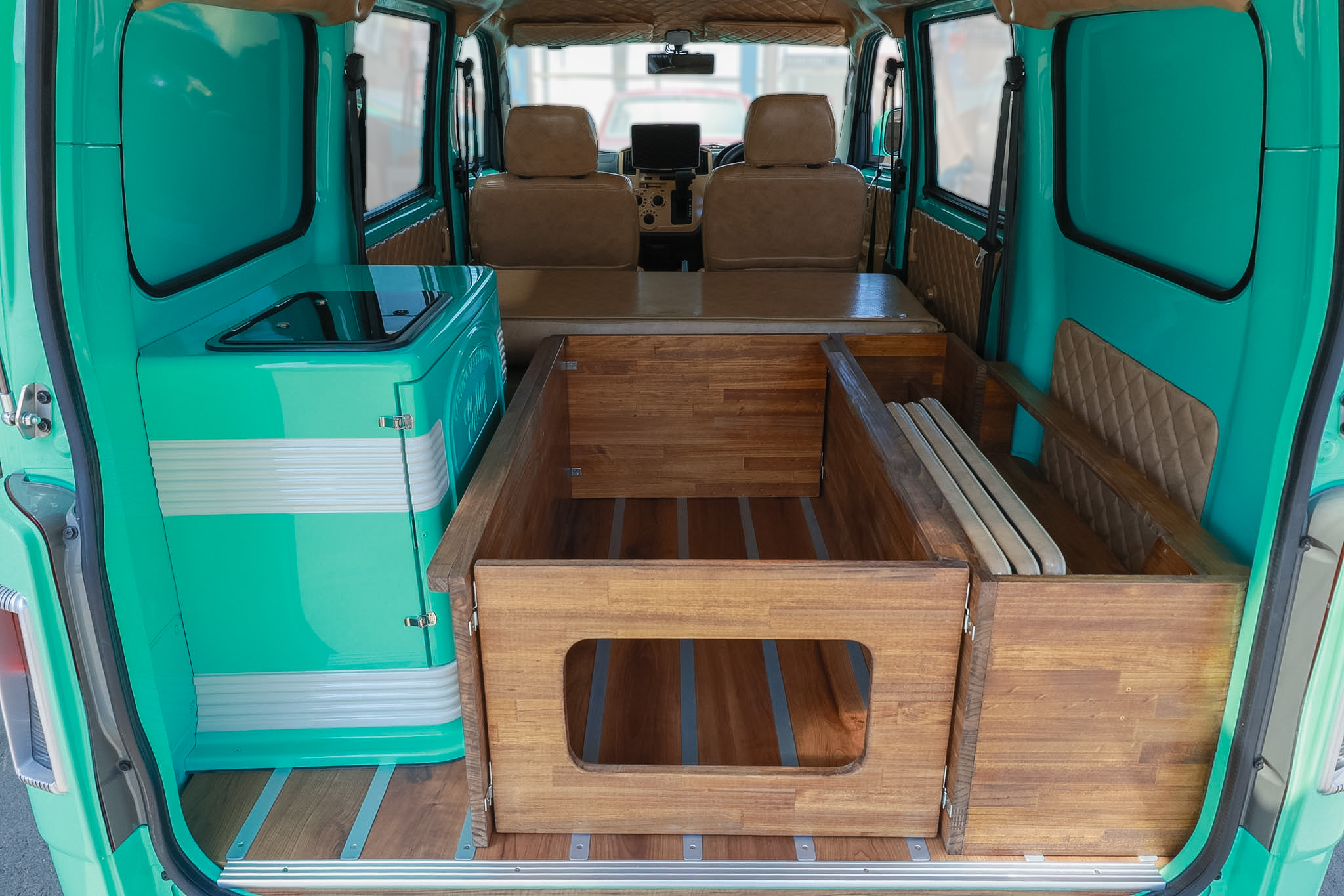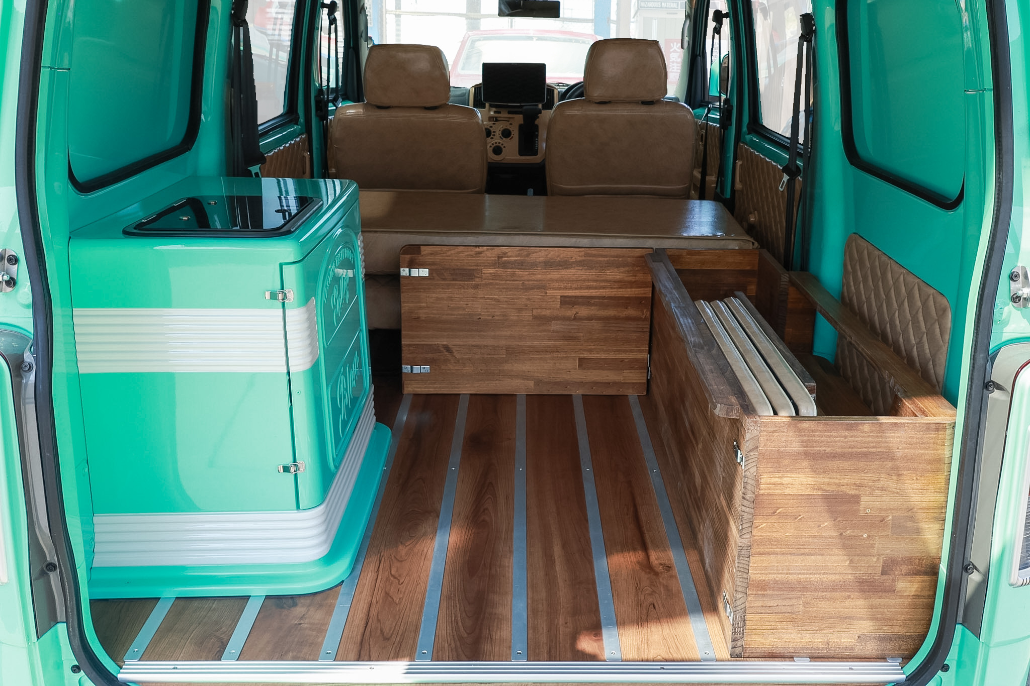無機質な荷室がリラックス空間になる、 木製フローリング。